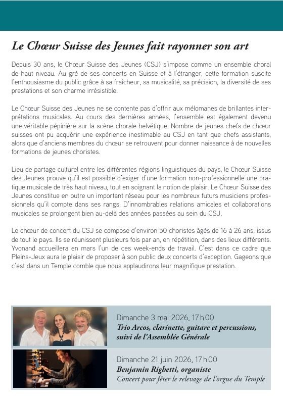 Pour la saison musicale 2024–2025, Pleins-Jeux vous invite à vivre des moments d’exception. Au fil des concerts, vous découvrirez une programmation éclectique, exigeante et enthousiasmante.
